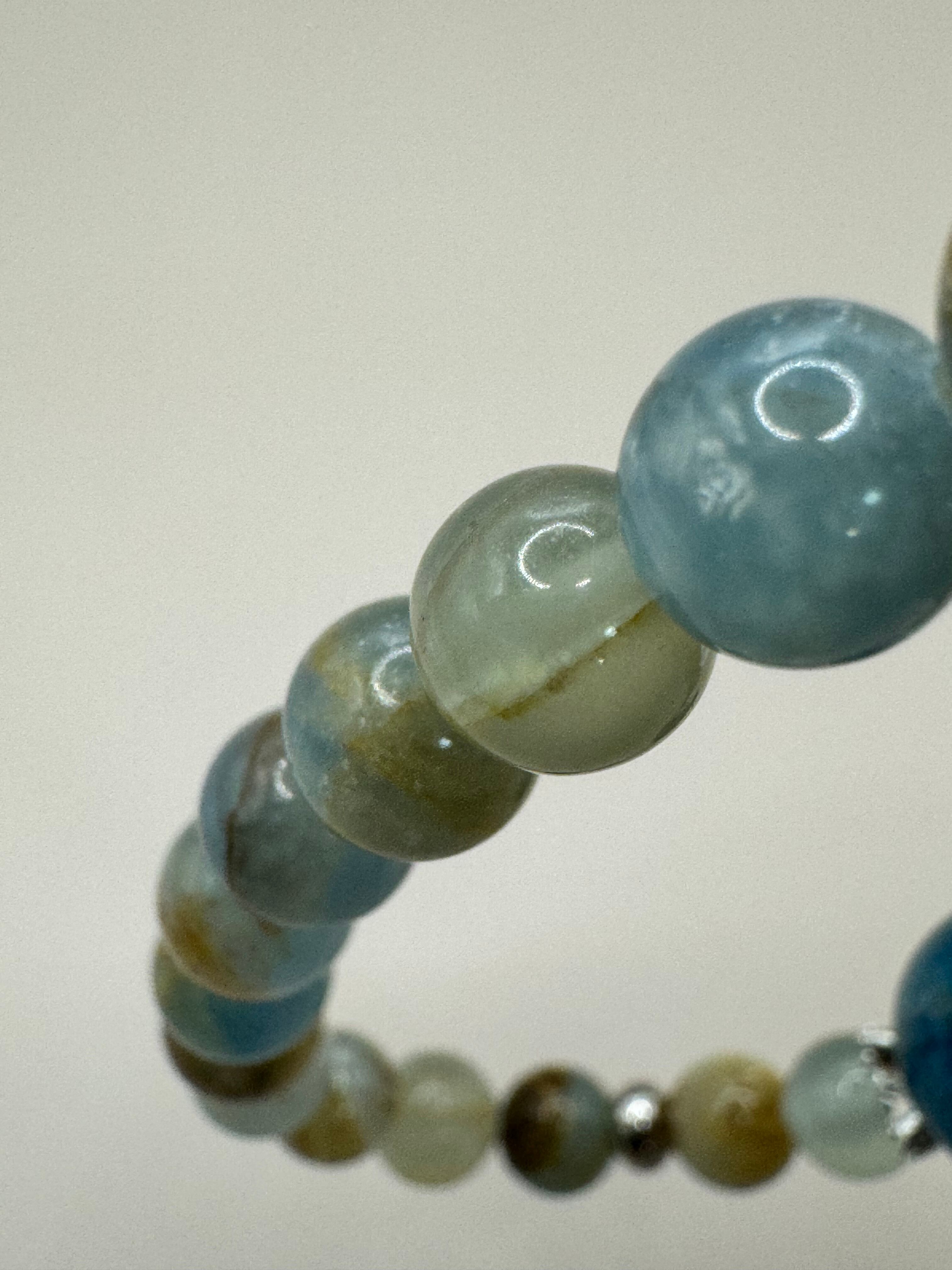 鮮やかなブルーが美しいアパタイトと、模様の美しいブルーオニキスを組み合わせたエレガントなブレスレットです。アパタイトは活力を与え、希望に満ちたエネルギーをもたらす石とされています。また、ブルーオニキスは自己表現を助け、心の安定をもたらすサポートをしてくれることで知られています。このブレスレットを着けることで、自信と集中力を高める良いサポートとなることでしょう。