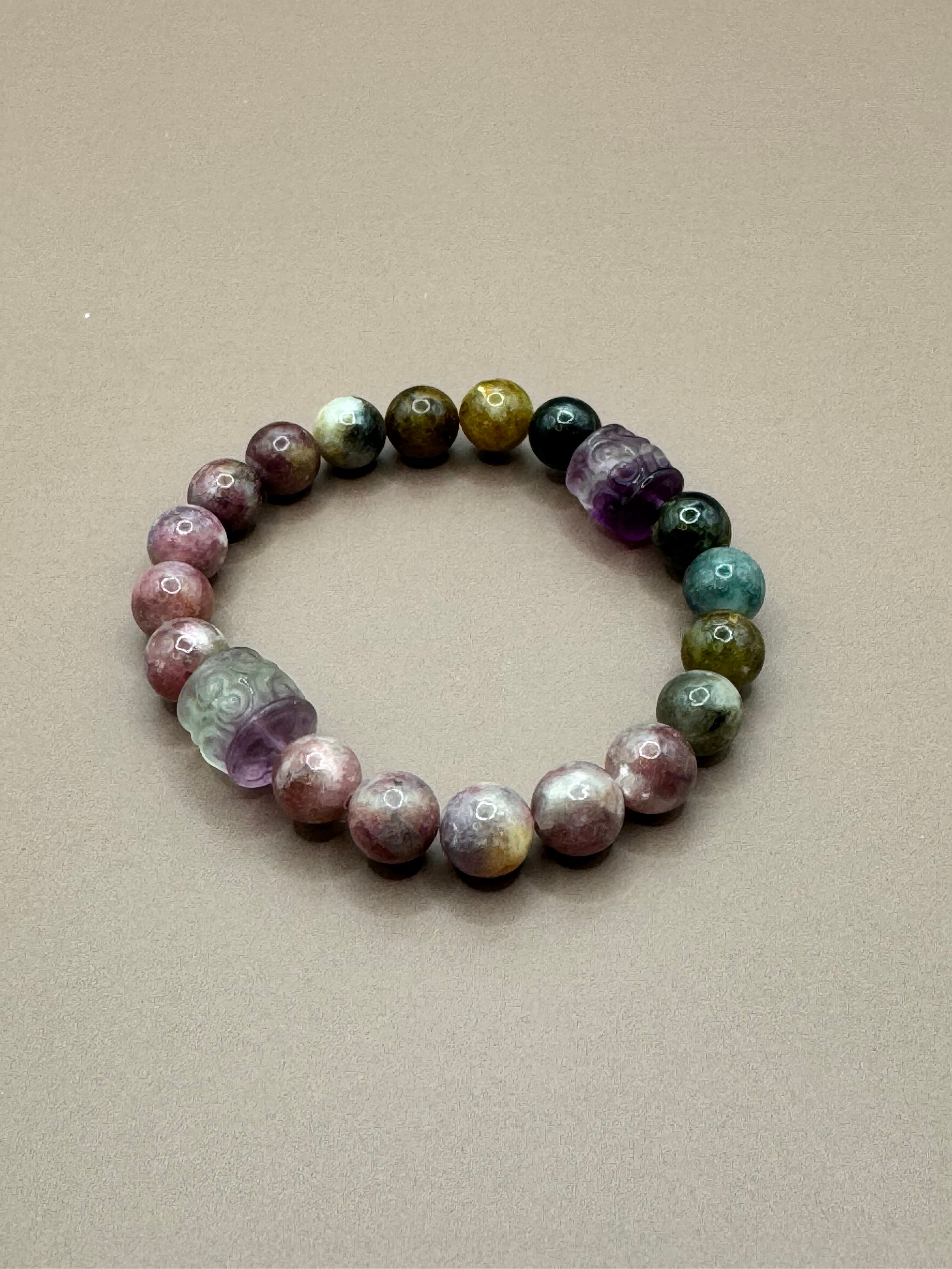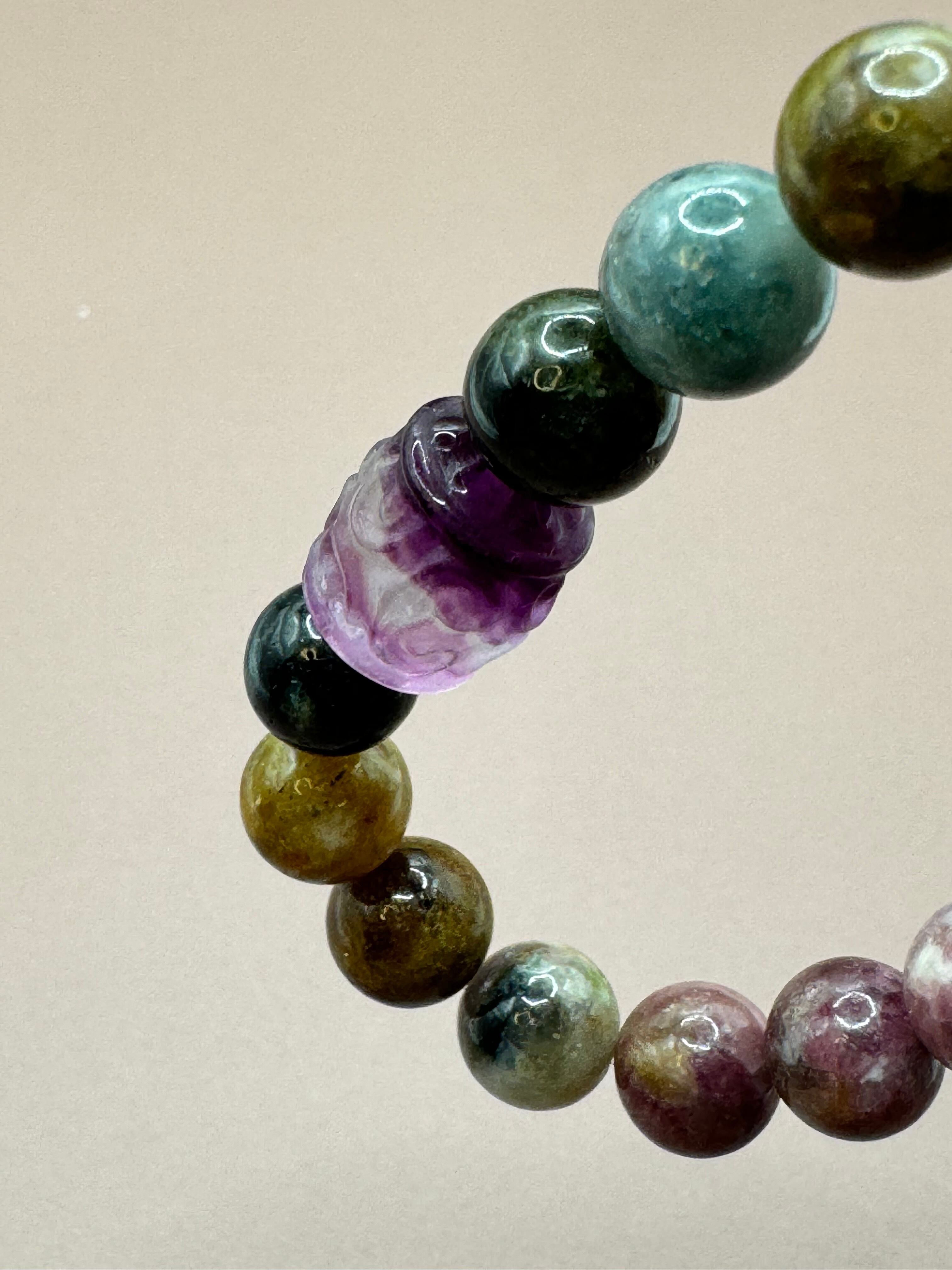 トルマリンは、愛を育み、感情を安定させるエネルギーを持っており、自分自身や他者との関係をより深いものにする手助けをしてくれます。一方、フローライトは意志力を高め、集中力を向上させる効能があり、さまざまな状況において心の平和をもたらしてくれるでしょう。このブレスレットを身につけることで、日々のストレスを和らげ、心の調和を感じる機会が増えるかもしれません。