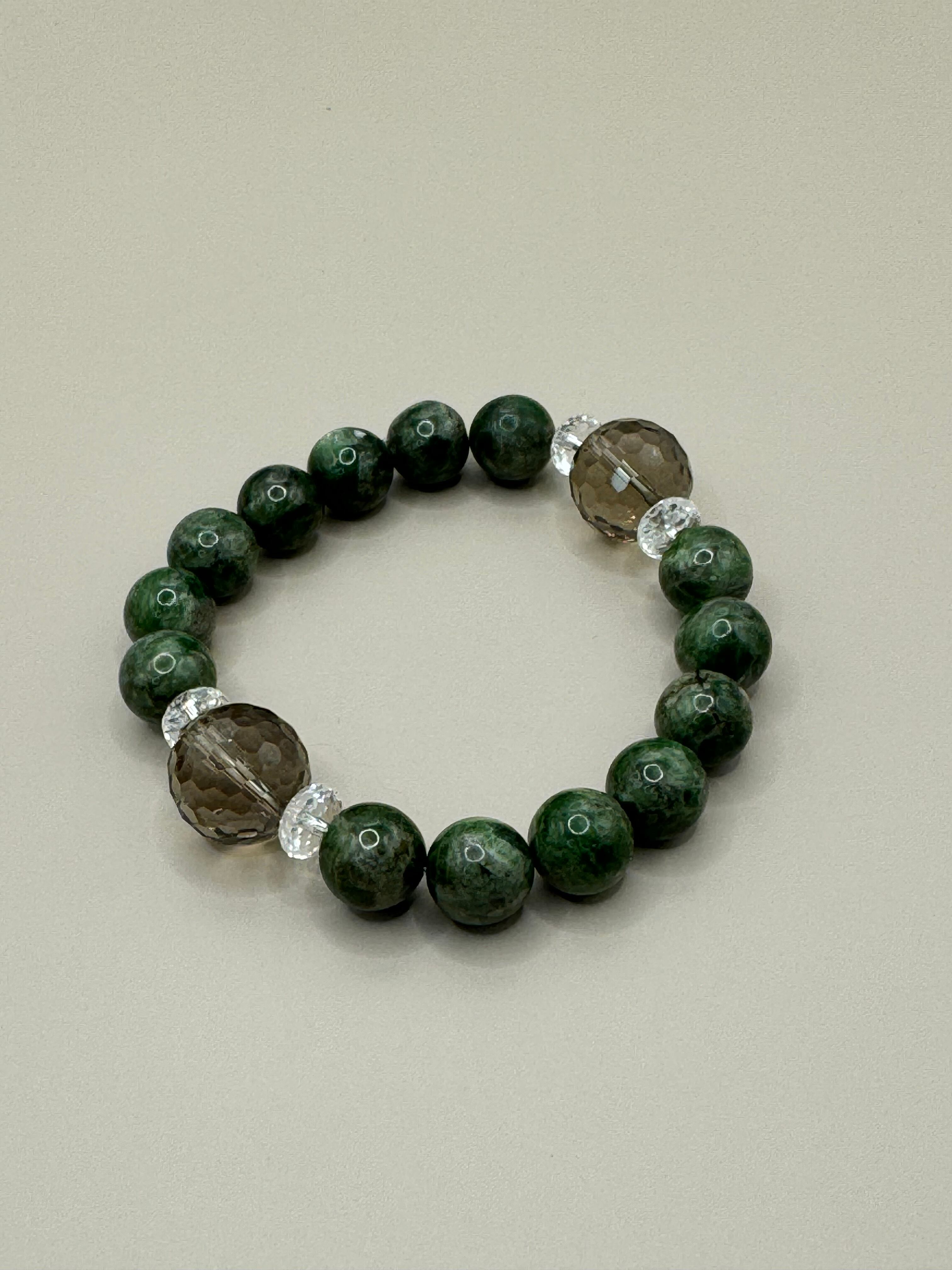 エレガントなデザインのブレスレットには、ダイオプサイトとスモーキークオーツ、そしてカットクリスタルを贅沢に使用しています。ダイオプサイトは、愛や調和をもたらし、心のバランスを整える力があります。スモーキークオーツは、地に足をつけた安定感を提供し、ストレスを和らげながら明確な思考を促進してくれます。このブレスレットを身につけることで、日常生活の中で安心感を得られるほか、心の調和を感じる機会が増えるかもしれません。