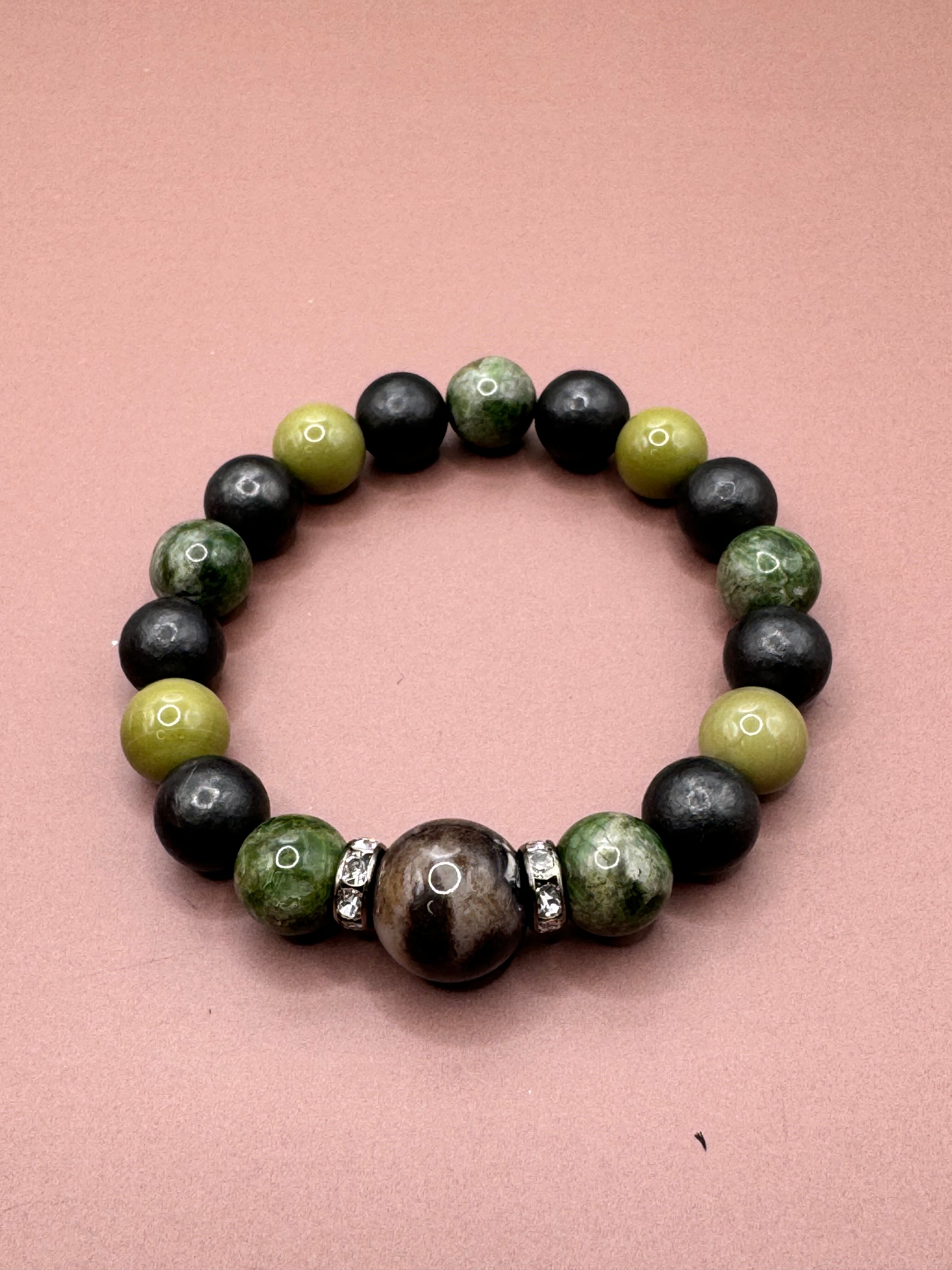 美しい夜桜メノウとダイオプサイト、アラシャン、シュンガイトを組み合わせたブレスレットは、心の静けさと調和をもたらす魅力的なデザインです。夜桜メノウは、浄化の力を持ち、ネガティブなエネルギーを取り除く効果が期待できます。また、ダイオプサイトは愛と人間関係を円滑にし、心のつながりを深めるサポートをします。アラシャンは、新たな活力と希望を引き出し、幸福感を高めるエネルギーを持っています。さらに、シュンガイトは強力な保護の石として知られ、周囲のエネルギーから身を守る助けをしてくれます。このブレスレットを身につけることで、日常生活の中で心の安らぎや調和を感じる機会が増えるかもしれません。