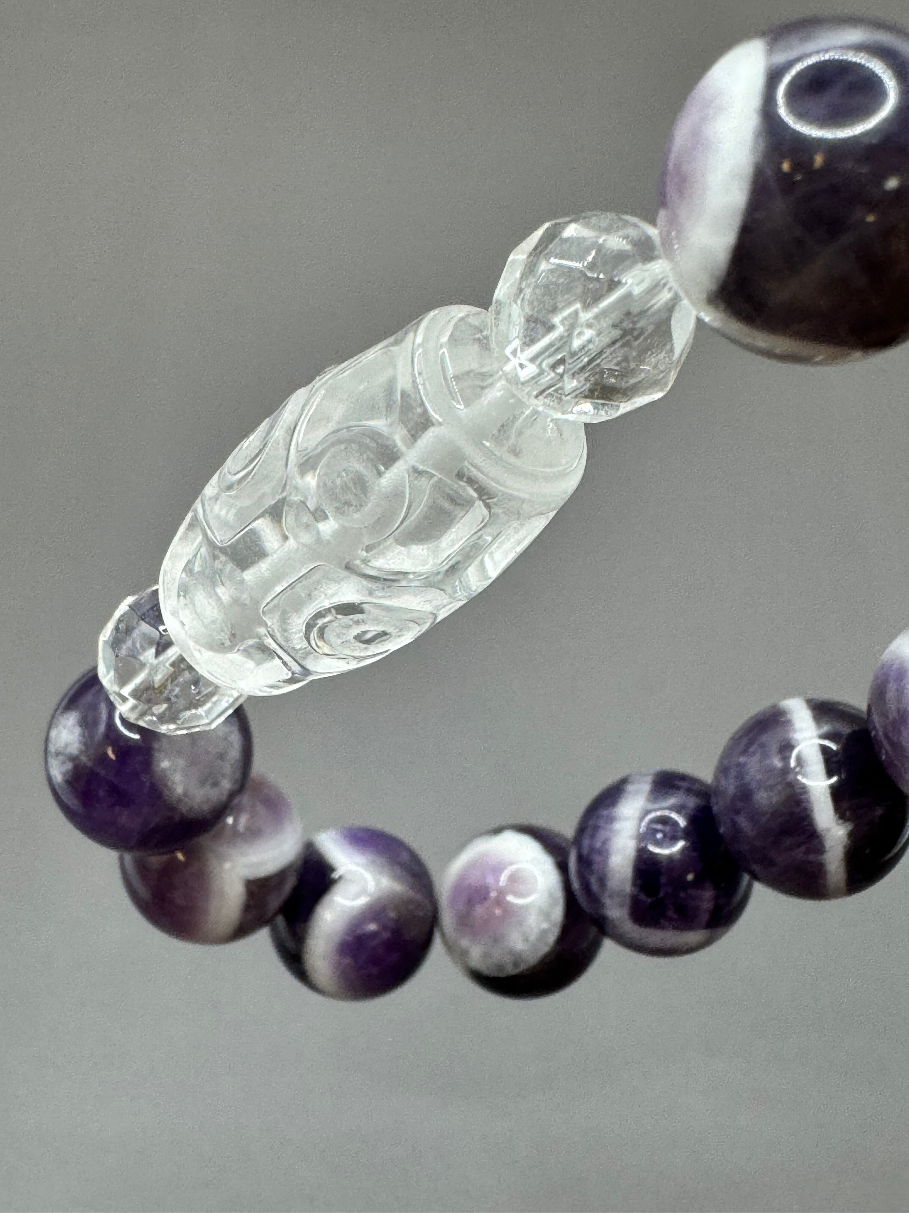 美しいドリームアメジストを使用したブレスレットは、心に平穏と安らぎをもたらす素敵なデザインです。ドリームアメジストは、持つ者の直感を高め、内面的な成長をサポートします。また、リラックス効果があり、ストレスを和らげる手助けをしてくれるでしょう。このブレスレットを身につけることで、毎日の生活において夢を追い求める勇気や癒しを感じる機会が増えるかもしれません。