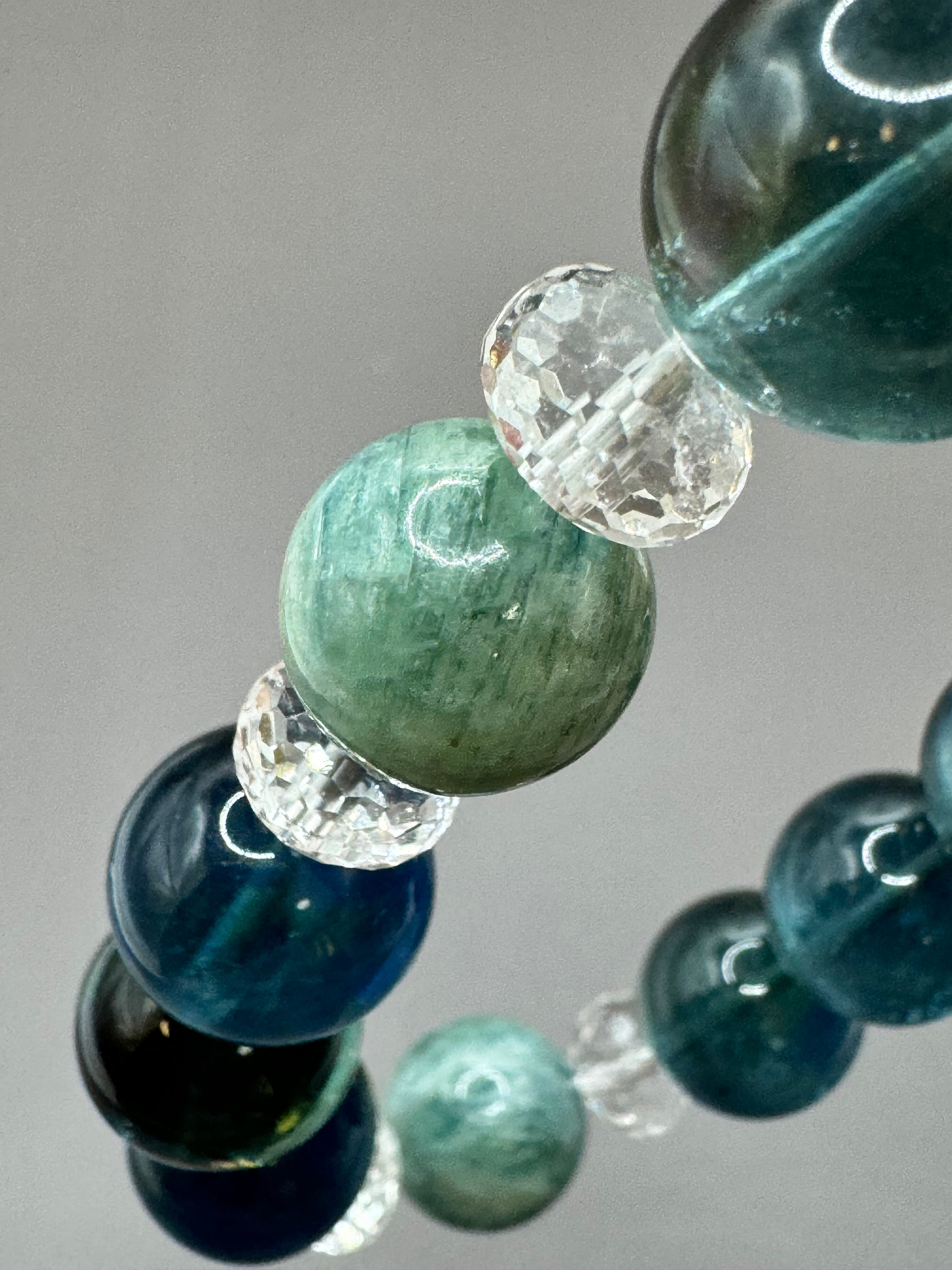 エレガントなグリーンカイヤナイトとブルーフローライト、そしてカットクリスタルを組み合わせたブレスレットは、心を穏やかにし、自己を高める魅力的なデザインです。グリーンカイヤナイトは持つ者に調和をもたらし、心の平穏をサポートしてくれます。また、ブルーフローライトは冷静な判断力を養い、状況を正しく見極める手助けをしてくれるでしょう。カットクリスタルは、その明晰さと純粋さから好運を引き寄せ、充実した日々をもたらす効果があります。このブレスレットを身につけることで、日常生活の中でポジティブなエネルギーを感じ、より良い自己成長を実感できる機会が増えるかもしれません。