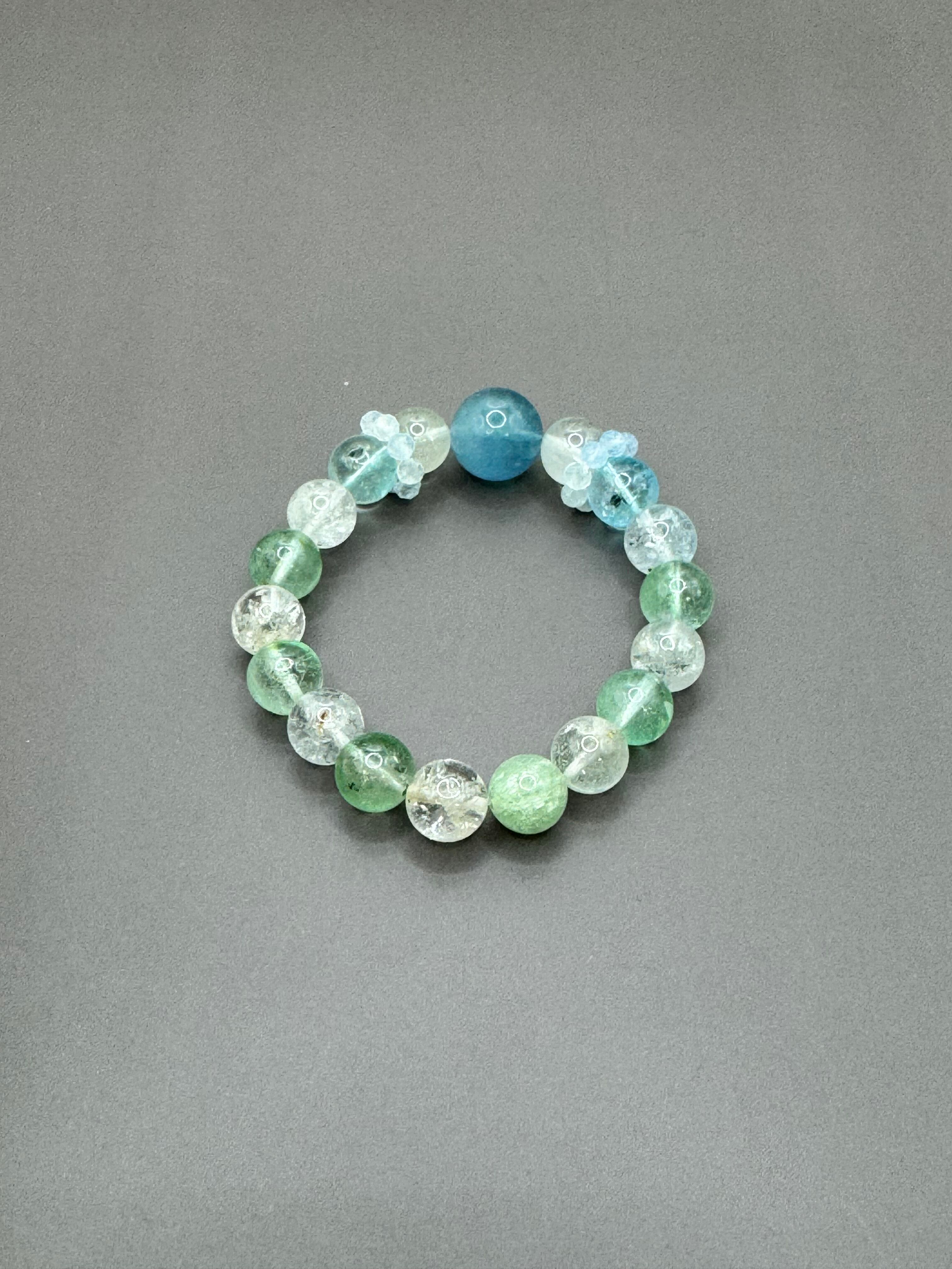 魅力的なデビルアクアマリンとトパーズを使用したブレスレットは、心を浄化し、自己を見つめ直す手助けをするデザインです。デビルアクアマリンは持つ者に冷静さをもたらし、感情のバランスを保つ効果が期待できます。また、トパーズは友情や愛情を深め、希望を与える石として知られています。このブレスレットを身につけることで、日常生活において心の安らぎやポジティブなエネルギーを感じ、自分自身をより深く理解できる機会が増えるかもしれません。