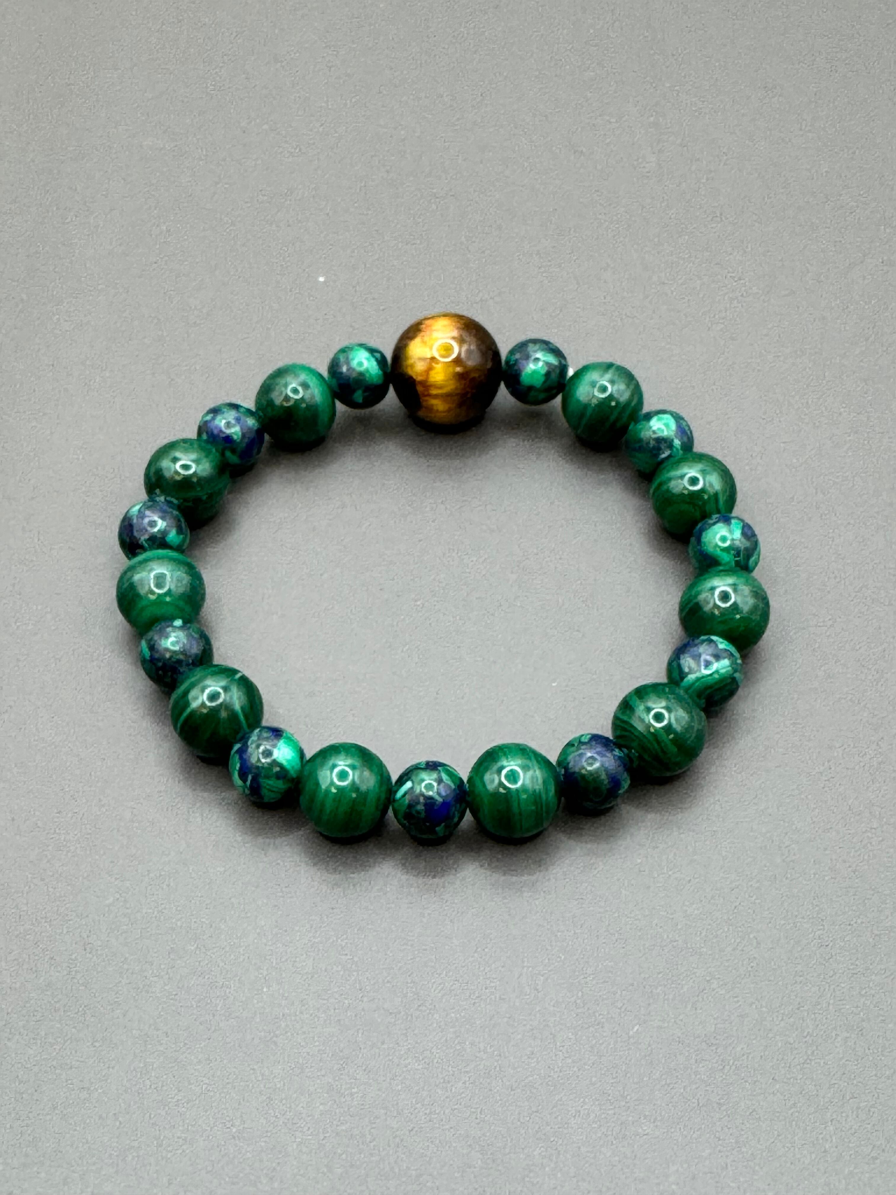 美しいイエローピーターサイトと深い緑色のマラカイト、そして神秘的なラピスラズリを組み合わせたブレスレットは、心を穏やかにし、内面の成長を助ける魅力的なデザインです。イエローピーターサイトは持つ者に精神的な発展をもたらし、明るい視点を与えます。マラカイトは変化をサポートし、ラピスラズリは真実を見極める力を引き出します。このブレスレットを身につけることで、日常生活において深い洞察を得る機会が増え、自分自身との調和を感じることができるでしょう。