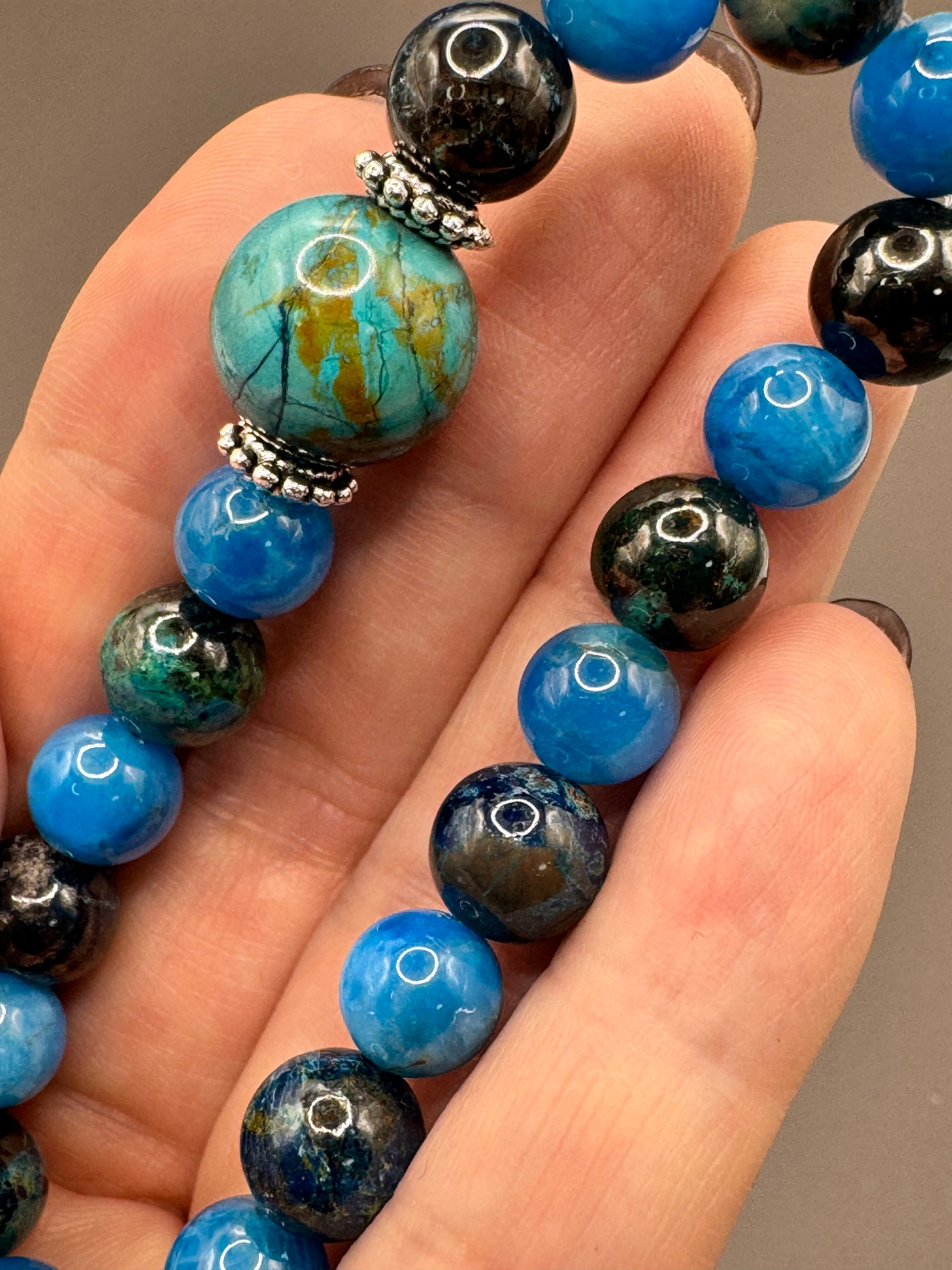 美しいクリソコラとアパタイトを使用したブレスレットは、心のバランスを整え、穏やかなコミュニケーションを促進する魅力的なデザインです。クリソコラは持つ者に安定した感情をもたらし、人間関係を深める助けとなります。また、アパタイトは創造性を引き出し、自己表現をサポートします。このブレスレットを身につけることで、日常生活において感情の安定を感じながら、豊かなコミュニケーションを楽しむことができるでしょう。