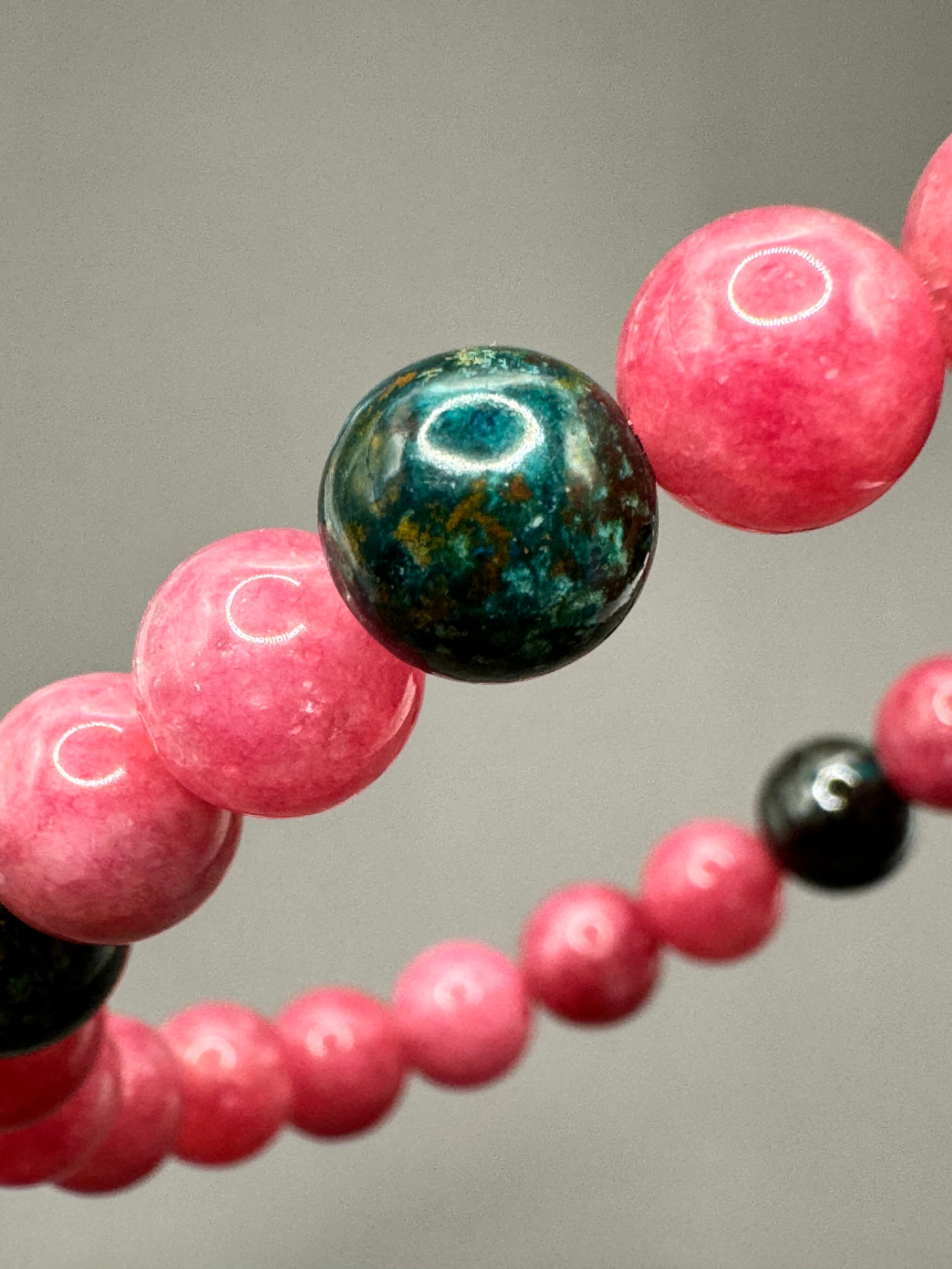 美しいクリソコラとカルセドニーを使用したブレスレットは、心の平和をサポートし、創造力を引き出すデザインです。クリソコラは自己表現を促進し、心に安らぎを与える効果があります。また、カルセドニーは社交性を高め、他者とのコミュニケーションを円滑にする助けになります。このブレスレットを身につけることで、日常生活の中で心地よさを感じながら、新たな発想に満ちた毎日を楽しむことができるでしょう。