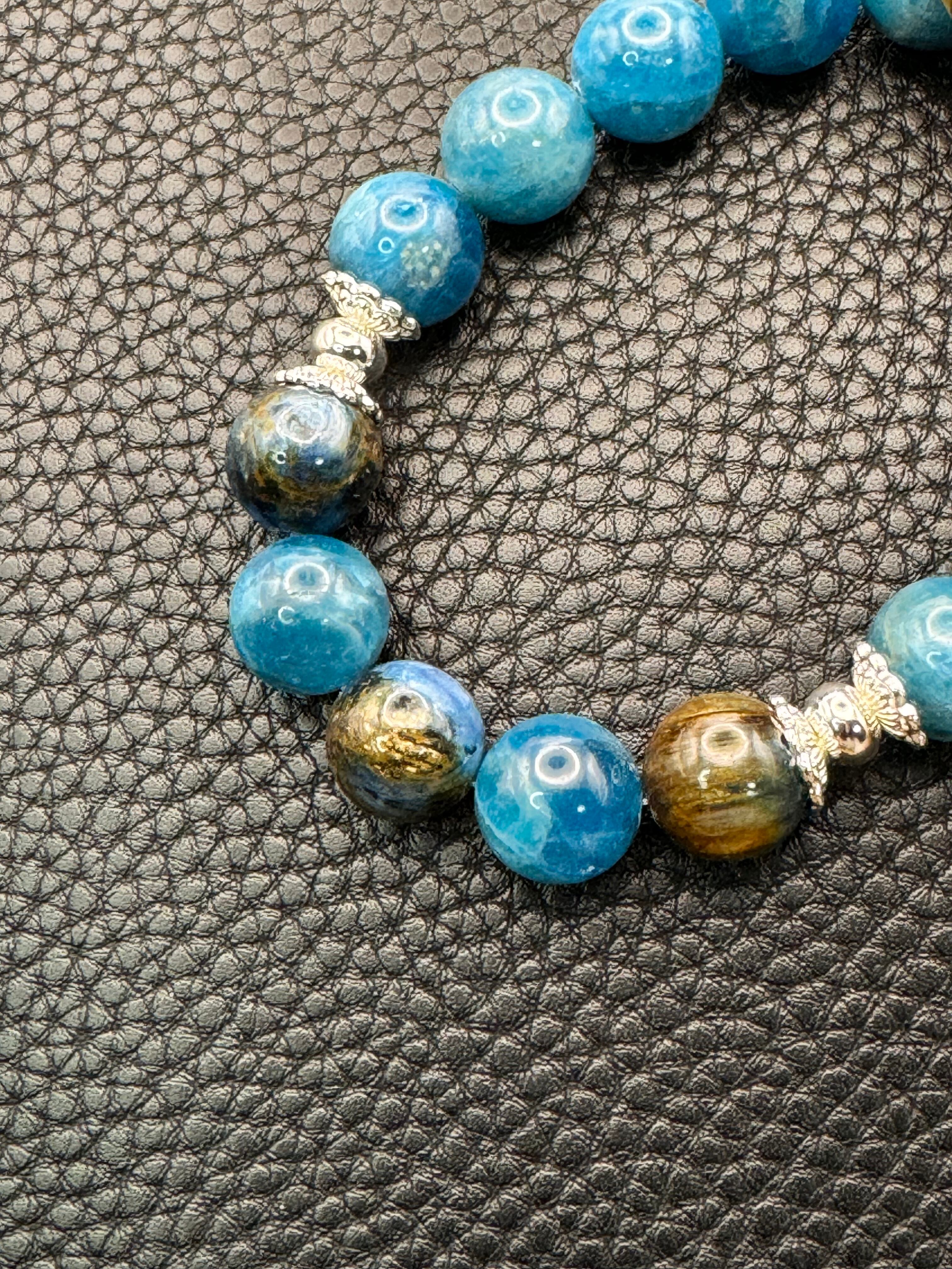 美しいアパタイトとカイヤナイトを使用したブレスレットは、心に自由な表現をもたらし、内なる成長を促進するデザインです。アパタイトは、コミュニケーション能力を高め、自己表現をサポートします。その鮮やかなブルーの色合いは、持つ人に創造的なインスピレーションを与えてくれます。カイヤナイトは、真実を見極め、集中力を高める効果が期待でき、特に瞑想時などにその力を発揮します。このブレスレットを身に着けることで、日々の生活の中で心が穏やかになり、より豊かな自己表現を楽しめるかもしれません。